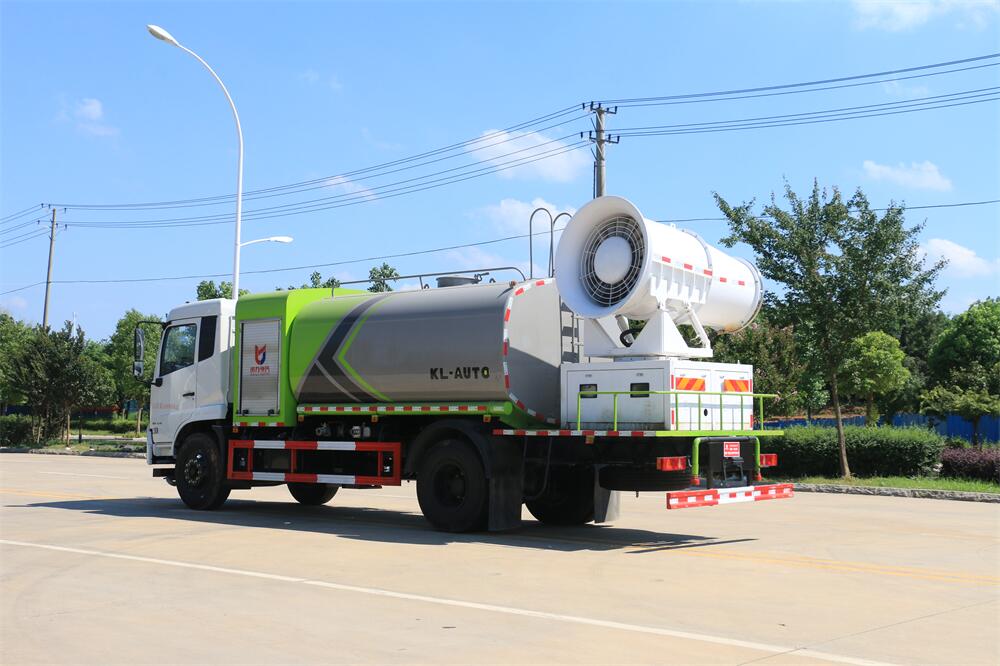 上裝配置:罐體容積為 12立方,選配風送式霧炮機組射程30米、40米、50米、60米、80米、100米、120米霧炮,罐體鋼板為4mm碳鋼Q235材質,罐內隔板具有防波作用,以減輕汽車行駛時罐體液體沖擊,罐體及整車外形尺寸按照公告。帶大功率專用灑水泵,泵可自吸自排,整車前沖、后灑、側噴、帶65消防接口,后平臺配CLW-50、CLW-60、CLW-80、CLW-100、CLW-120型風送式霧炮機組;罐體前封頭配大功率柴油發電機組;前封頭帶水位計,后平臺主管路帶1寸澆花接口,后爬梯。帶兩根輸水管及陰陽端。罐體顏色:銀/灰/綠,罐體兩側噴“多功能抑塵車”字樣,貼反光標示。