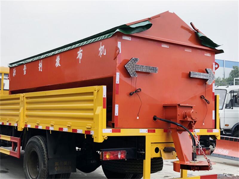 發(fā)動(dòng)機(jī)帶動(dòng)導(dǎo)輥旋轉(zhuǎn),把料箱中的融雪劑輸送到撒布斗,通過(guò)撒布斗的旋轉(zhuǎn)把融雪劑均勻撒布到路面。